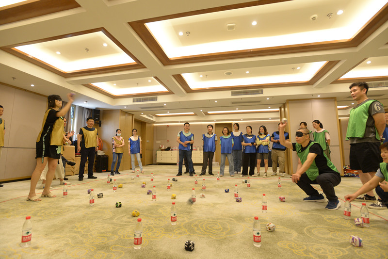 拓展活动分为三个部分,上午在教练带领下进行了热身游戏、队名队歌展示、分组对抗游戏三个环节,各小队队员团结协作,积极沟通,群策群力,共同完成游戏,现场气氛异常热烈。中午进行了党建答题活动,通过答题活动这种形式给各位职工提供一次党建理论知识学习的机会。下午进行了多米诺骨牌搭建,大家经过多次的失败和重建,终于完成了骨牌搭建,随着启动球撞向第一排骨牌,所有骨牌依次倒下,图案中展现出省大数据管理中心的logo和本活动主题“攻坚克难做数据,同心喜迎二十大”。