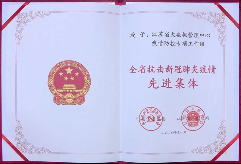 江苏省大数据管理中心疫情防控专项工作组获得了“全省抗击新冠肺炎疫情先进集体”称号。
