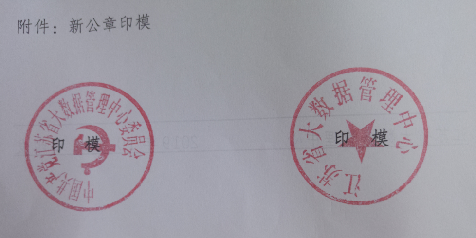 根据省编委《关于江苏省信息中心更名并调整隶属关系的通知》(苏编〔2019〕27号)文件精神,江苏省信息中心更名为江苏省大数据管理中心,自即日起启用“中国共产党江苏省大数据管理中心委员会”、“江苏省大数据管理中心”印章,原“中国共产党江苏省信息中心委员会”、“江苏省信息中心”印章同时作废。