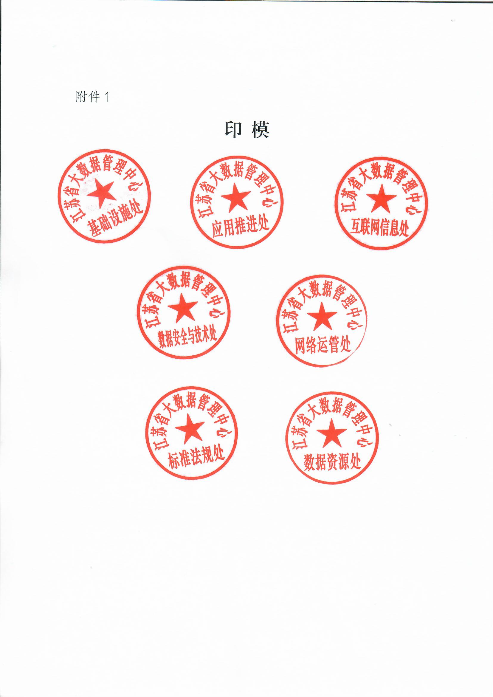 因机构调整,即日起启用以下印章:“江苏省大数据管理中心标准法规处”、“江苏省大数据管理中心数据资源处”、“江苏省大数据管理中心基础设施处”、“江苏省大数据管理中心数据安全与技术处”、“江苏省大数据管理中心网络运管处”、“江苏省大数据管理中心应用推进处”和“江苏省大数据管理中心互联网信息处”。
