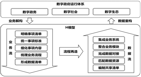 “十四五”时期,采用上述H模型,全面梳理政府各项业务和信息系统,解构形成最小颗粒度的业务组件和数据单元,针对跨地区跨部门跨层级的高频事项,率先开展流程再造,匹配相关业务组件和数据单元,重构业务系统。在此基础上,倒逼各部门业务系统的流程优化和功能整合,实现数字政府运行体系的整体重塑。