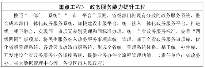 高质效政务运行走在全国前列。建成全省一体化政务协同运行体系,有力支撑和驱动“放管服”改革,畅通直达人民群众和市场主体的服务渠道,实现数字政务与人民群众生产、生活、生态相生相融,政务运行一体事联办完成率达到80%。