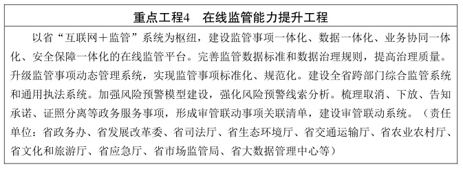 重构升级全省一体化在线监管平台,集成“互联网+监管”系统和市场监管、行政执法等专业系统,规范监管业务流程,在全省范围实现数据共享共用和监管业务协同。完善全省监管事项、监管对象、监管行为数据库,建立健全重点领域风险预警系统,及时发现、动态管理重点监管对象,形成有针对性的联合检查任务;建立健全跨部门综合监管系统,满足各地各部门联合检查业务需求;建立健全通用执法系统,并在基层推广普及移动执法应用,实现规范执法、全程留痕,增强执法有效性,减轻基层执法人员负担。对接国家“互联网+监管”平台,获得更广泛数据支持,形成更大范围更广领域综合监管的示范经验。(责任单位:省政务办、省市场监管局、省司法厅等,各设区市人民政府)