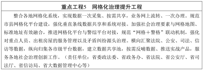 推进基层治理数字化。深化“大数据+网格化+铁脚板”治理机制,智能精准地管理网格内人、地、物、事、组织等,推行网格+服务、网格+治理、网格+安全、网格+信访等。扩大“雪亮工程”覆盖面,推进“平安前哨”工程建设,推动地址要素数字化,加强社会治安综合治理。推进公共法律服务、矛盾调解、司法救助等领域信息化建设,拓展司法救助方式,多元化解矛盾纠纷。拓宽养老服务投诉受理渠道,智能化监管养老服务。深度融合网格化社会治理手段,完善民族宗教信息化平台。(责任单位:省委政法委、省政务办、省公安厅、省信访局、省司法厅、省民政厅、省民宗委等,各设区市人民政府)