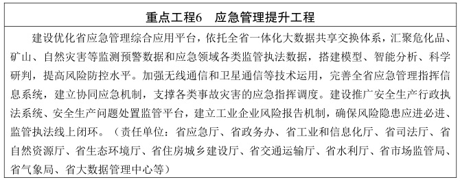 推进应急治理数字化。整合应急业务系统,优化监测预警、指挥调度、抢险救援三大系统,提高分析研判、决策指挥、社会动员等能力,有效识别和化解重大风险,遏制重特大事故发生。探索建立长三角区域数字应急一体化协同机制,提高重大公共安全事件响应效率。加强公共卫生领域应急管理,建立全省疾病预防控制体系。建设重点行业安全生产监测预警系统,提高工业企业安全生产风险应急处置能力。建设人防综合信息平台,提升人防治安防控水平。优化水旱灾害防御调度指挥系统,实现预报调度一体化、调度决策智能化、调度过程可视化。加强粮食和物资储备相关数据库建设,实时掌握各类情况,及时应对各种突发事件。(责任单位:省应急厅、省卫生健康委、省工业和信息化厅、省人防办、省水利厅、省粮食和储备局等)