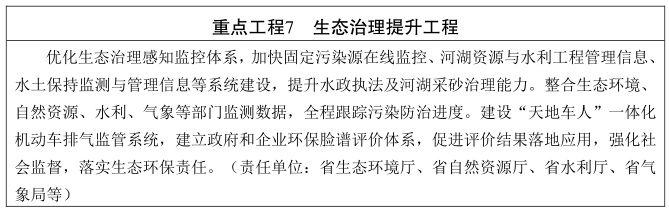 推进生态治理数字化。以生态环境大数据平台为基础,整合危险废物监控、排污权管理、生态环境执法、污染防治监管等应用,推动生态数据互通共享,提升非现场监管指挥调度能力。加强大气、水、海洋、土壤和噪音等污染监测监控、预测预报、应急处置和评价考核,实现闭环管理。加大水资源与节约用水监控力度,提升水资源管理和调度能力。(责任单位:省生态环境厅、省水利厅等)