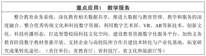 优化数字教育建设。开展慕课、名师空中课堂等线上教育,满足多样化需求。整合教育、文化、科技、体育等资源,提高教育教学、校园文化、校园科技等领域数字化水平。建设终身学习平台,扩展教育内容、时间和空间维度。完善教育管理信息公共服务平台,推动教育管理和决策科学化。推广“互联网+义务教育”城乡学校网络结对,助力城乡优质教育资源普惠共享。(责任单位:省教育厅、省文化和旅游厅、省科技厅、省体育局等)