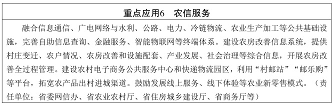 深化数字乡村建设。实施乡村新一代信息基础设施振兴工程和智慧广电乡村工程,提升农村光纤网络水平和覆盖深度,实现城乡信息通信网络服务能力一体化。推进农业农村大数据平台建设,打造全省农业“一张图”。建立完善农业农村定点定位网络监测体系,实现乡镇环境空气质量自动监测站点全覆盖。深化平安乡村建设,优化农村治安防控体系。健全农业科技信息服务渠道,加快乡村教育信息化建设,优化农村公共卫生信息服务,加强新农民新技术教育培训。推动全省大中型灌区管理、渔船管理、农产品质量安全管理等领域数字化,开展农村信用评价,积极发展数字乡村新业态。(责任单位:省委网信办、省工业和信息化厅、省农业农村厅、省生态环境厅、省公安厅、省科技厅、省教育厅、省卫生健康委、省水利厅、省交通运输厅、省商务厅等)