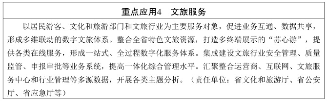 推动数字文旅建设。构建数字文旅体系,推动文旅资源数字化、工作智能化、服务精准化。开发文旅大数据,精准推送个性化文旅产品和服务,促进优质文旅资源向公众开放。加强扬子江创意城市群、沿大运河特色文化产业带、黄海湿地、长三角区域文旅产业一体化发展示范区等领域数字化建设,推动智能酒店、沉浸式游乐园、数字博物馆、数字文化馆、数字展览馆等新业态发展。(责任单位:省文化和旅游厅等)