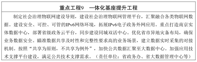 高水平支撑能力走在全国前列。统一的智能感知、云网环境、数据共享、应用技术等基础支撑体系全面建成,标准规范体系更加完善,政务应用入驻“苏服办”总入口率达到90%,非涉密专网整合率达到90%,非涉密系统整合上云率达到95%,公共数据按需共享率达到99%,政务应用入驻总入口率达到90%。